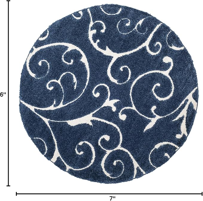 SAFAVIEH Florida Shag Collection Area Rug - 6'7" Round, Dark Blue & Cream, Scroll Design, Non-Shedding & Easy Care, 1.2-inch Thick Ideal for High Traffic Areas in Living Room, Bedroom (SG455-6511)