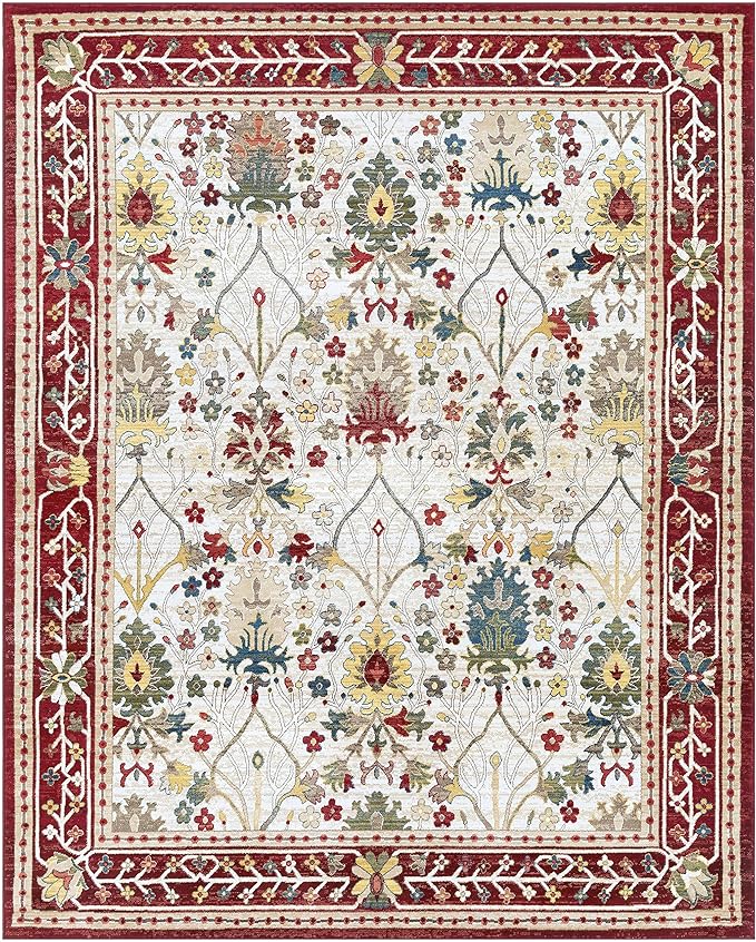 Hauteloom Goff Boho Floral Living Room Bedroom Multicolor Area Rug - Floral - Bohemian Vintage Look - Oriental Turkish Pattern - White, Beige, Yellow, Red - 5'1" x 7'5"