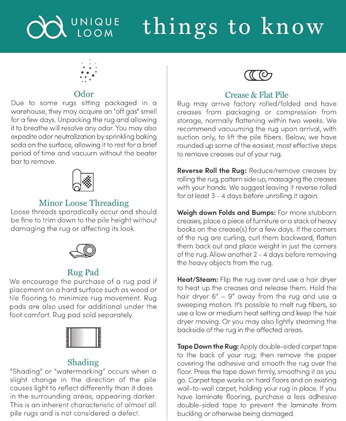 - SHIPPING: Rug will arrive factory rolled/folded and may have creases from packaging & compression from storage, flatting over time.
