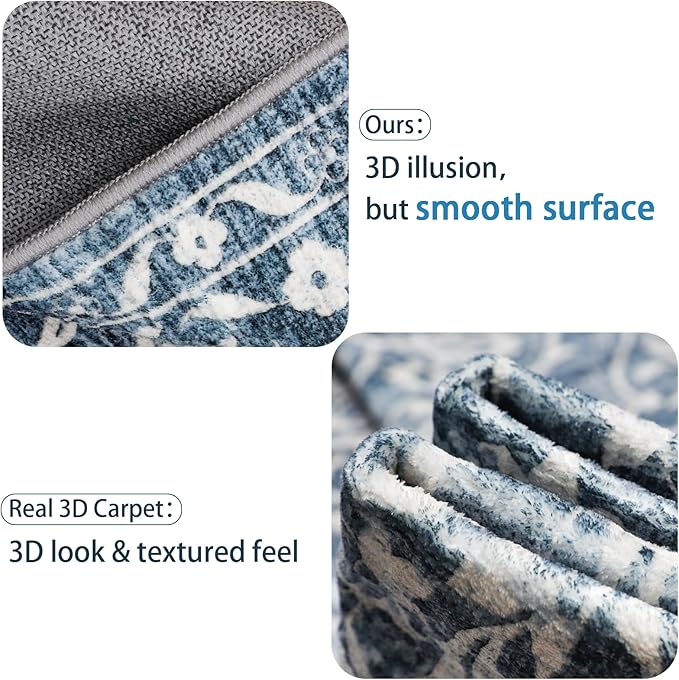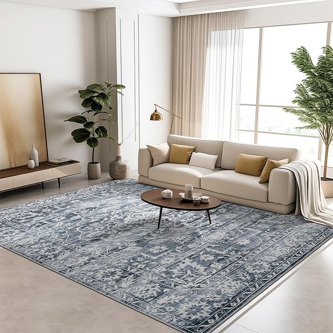 6x9 Area Rugs for Living Room, Stain Resistant Washable Rugs for Dining Room, Floral Vintage Non-Slip Thin Area Rug(Blue, 6'x9')