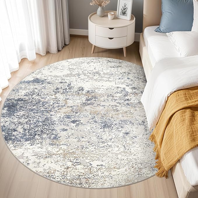 5ft Round Area Rug Living Room Rugs - 5x5 Washable Large Soft Indoor Neutral Modern Abstract Low Pile Rug Carpet for Bedroom Dining Room Farmhouse Home Office - Beige Blue