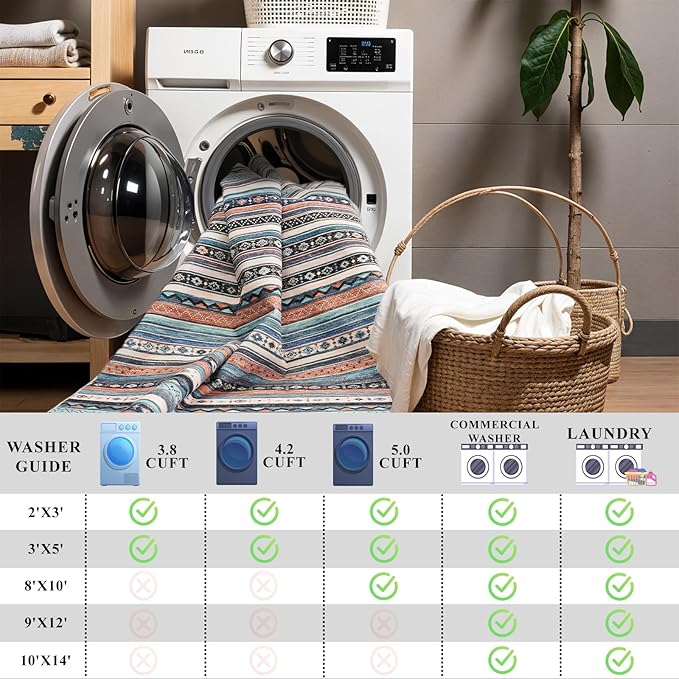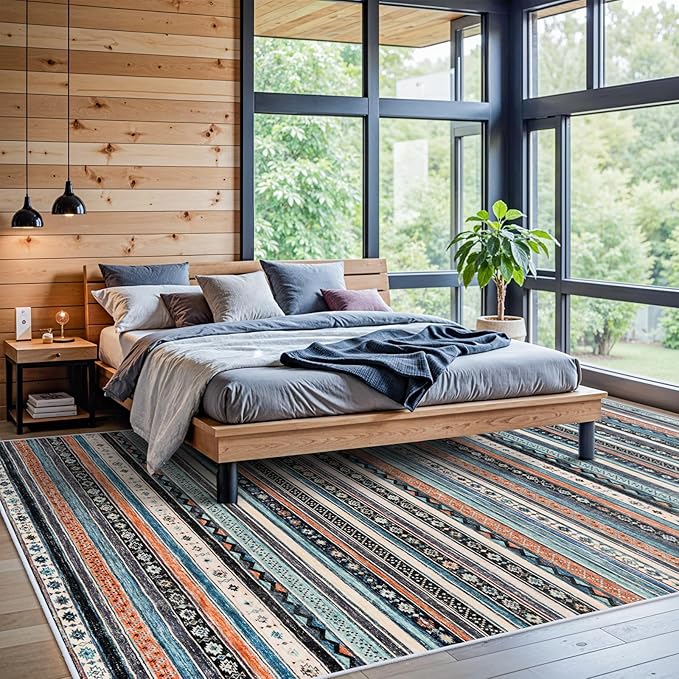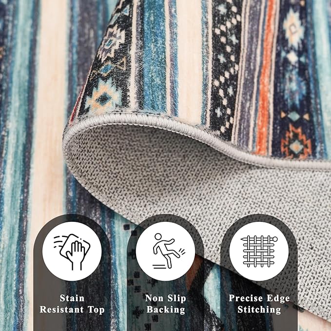10x14 Rug for Living Room Washable, Large Striped Farmhouse Area Rugs for Bedroom Soft Ultra Thin Indoor Carpet Non Slip Stain Resistant Dining Room Rug Waterproof Southwest Style, 10x14 Blue/Multi