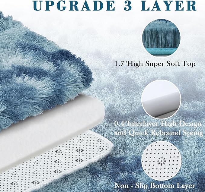 - Upgrade Non Slip Bottom Rug: The plush fuzzy bedroom rug has thousands of non slip points at the bottom, ensuring that the carpet is firmly fixed to the ground and enhancing safety. A 0.3 inch thick memory sponge is used in the middle of the rug to reduce the spread of footsteps and other noise, creating a quiet and relaxed living environment