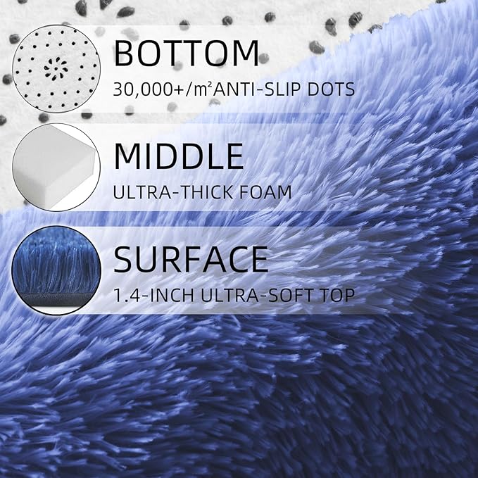 - Upgrade Non Slip Bottom Rug: The plush fuzzy bedroom rug has thousands of non slip points at the bottom, ensuring that the carpet is firmly fixed to the ground and enhancing safety. A 0.3 inch thick memory sponge is used in the middle of the rug to reduce the spread of footsteps and other noise, creating a quiet and relaxed living environment