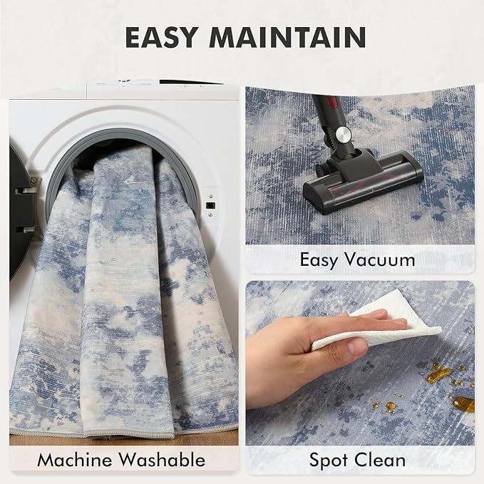 - Machine Washable: Easy care area carpets for home with kids and pets. Liquids bead up for easy wiping, and debris vacuums off thoroughly. Low pile rug minimizes dust and hair accumulation and fits effortlessly under furniture without causing imbalance. Cleanliness-conscious person can toss this washable area rug into the machine without worrying about fees or quality loss.