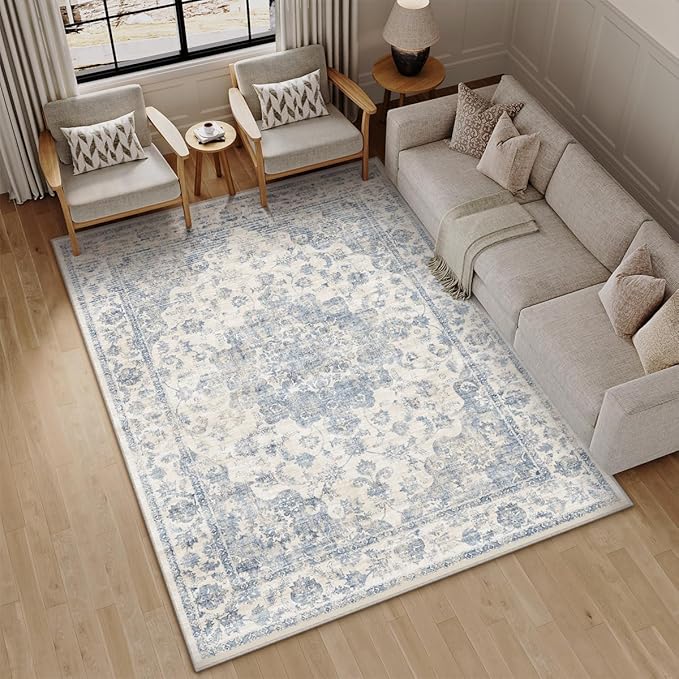 5x7 Washable Neutral Area Rug Blue Floral Living Room Bedroom Carpet Non-Slip Low Pile Vintage Lightweight Vacuumable Soft Throw Rug for Dining Room Entryway Office Kitchen