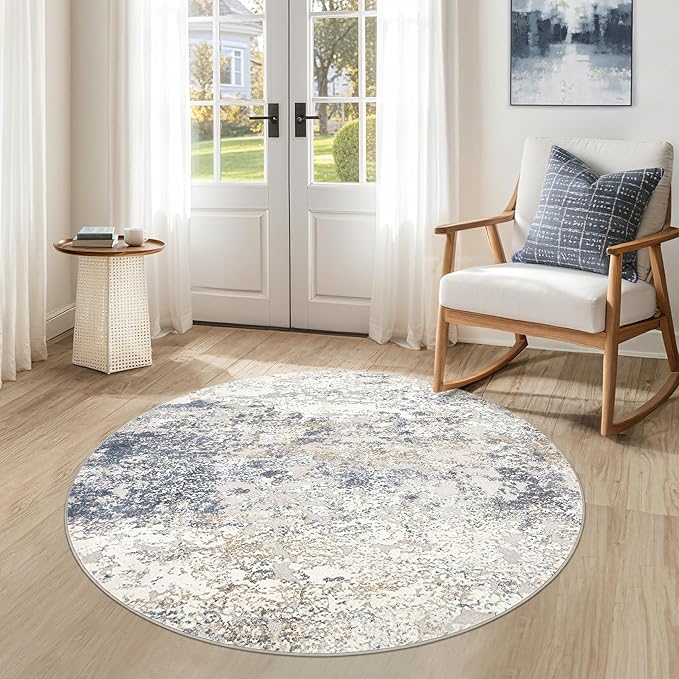 4ft Round Area Rug Living Room Rugs - 4x4 Washable Large Soft Indoor Neutral Modern Abstract Low Pile Rug Carpet for Bedroom Dining Room Farmhouse Home Office - Beige Blue