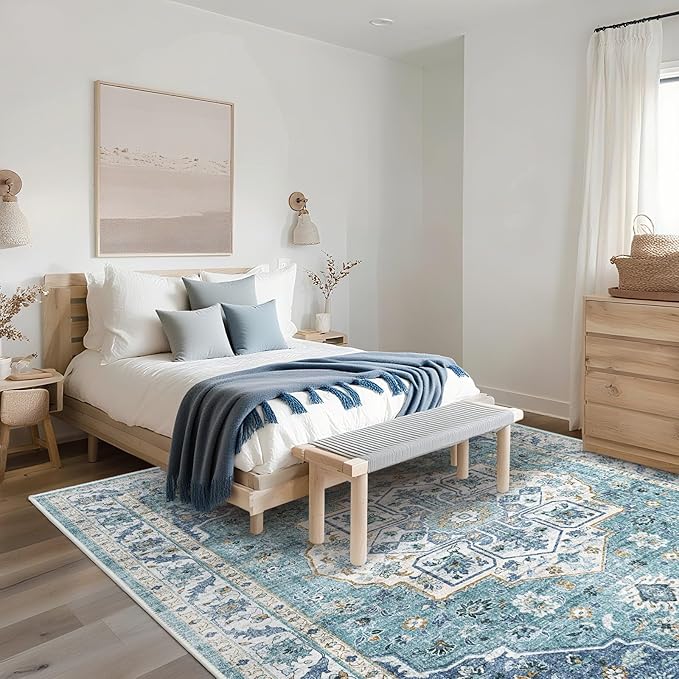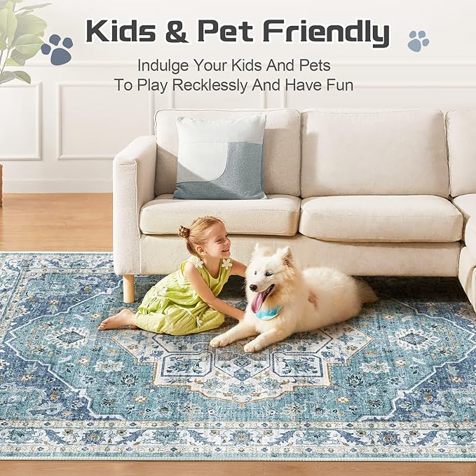 ANSSO 5x7 Area Rug for Living Room, Machine Washable Low Pile Rugs, Non-Slip Backing Vintage Carpet for Bedroom, Dining Room, Home Office Decor Turquoise Blue